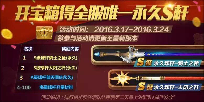 活动内容:新一期开宝箱活动限时开启!参与不但可以赢取全服唯一永久S杆, 而且可以获得丰富的材料和球杆碎片等奖品哦~