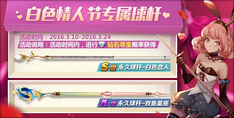 白色情人节即将浪漫来临!腾讯桌球为各位球友特意准备了白色情人节5重活动,白色恋人首次震撼出场,同时新的星座球杆横空出世,来看看是哪位亲的幸运星座吧~